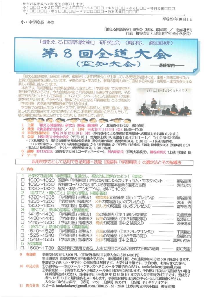 平成30年1月5日上砂川町立中央小学校で「鍛える国語教室」研究会第8回全道大会を開催します。今大会は野口芳宏先生をはじめ,群馬大学の河内先生をお迎えし,学ばせていただきます。